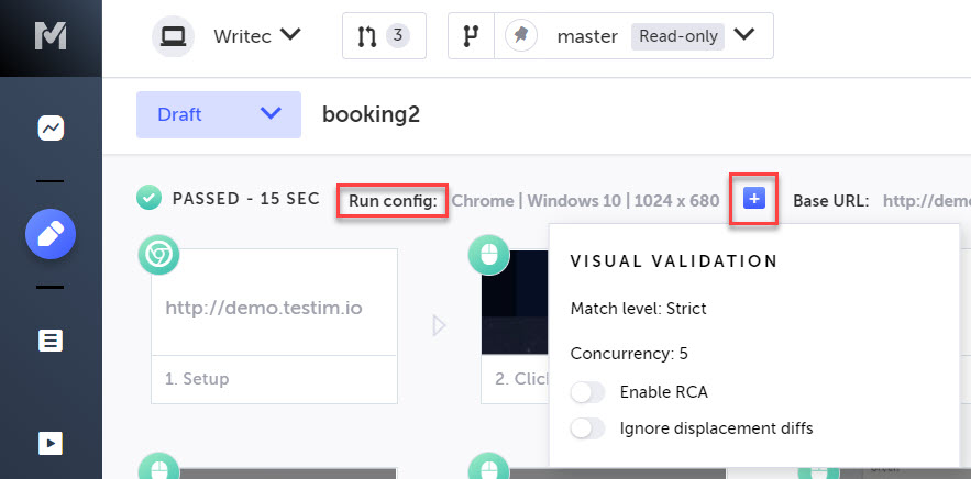 The Run Config section becomes available for every test run in a project that is integrated with Applitools. → To view the Visual Validation parameters: