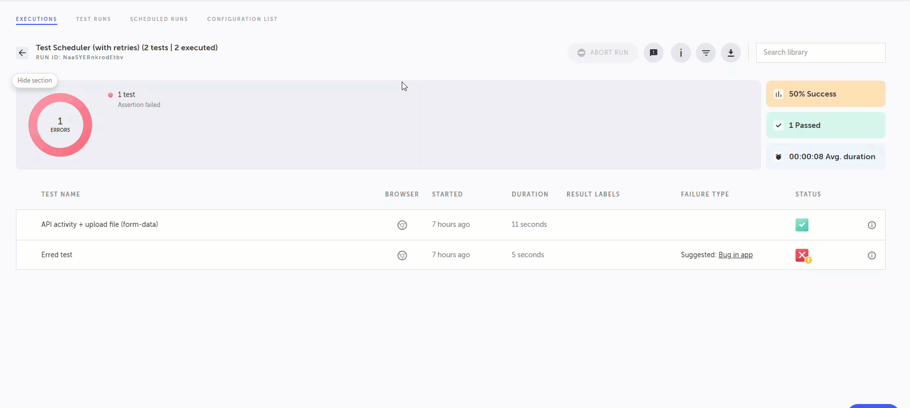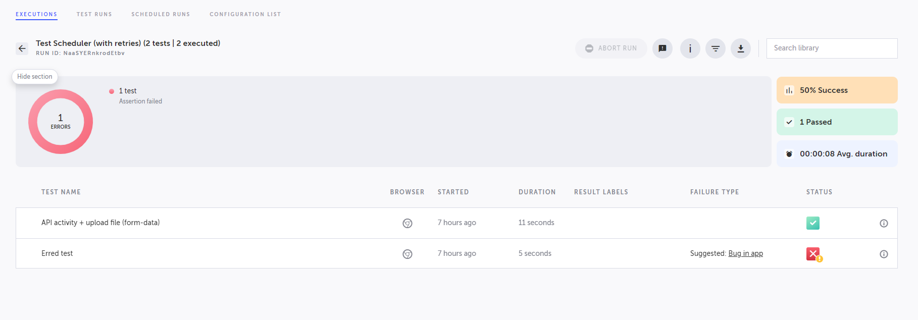 When a test run had a few retries, it is possible to view the retries' results. Test run with retries will have a yellow (!) marking on the status icon.