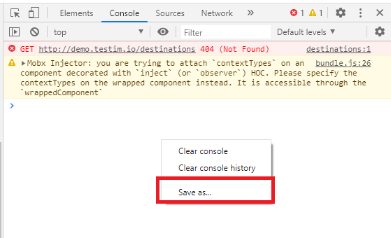 Once the page is loaded, select the Console tab and right-click in the console box. A menu is displayed.