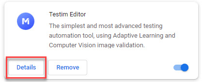 Locate the Testim Editor extension and click the Details button.