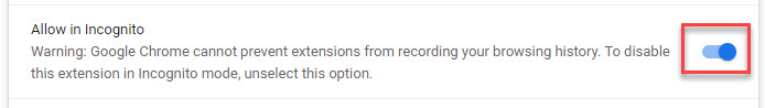 Toggle the Allow in Incognito setting to On.