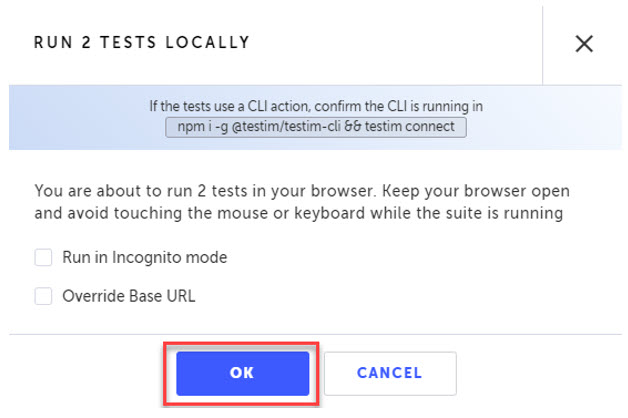 Run in Incognito Mode - select this option if you would like to run a test as if it was the first time it has run. This is great when you want to mimic how the test performs on a remote run or via the CLI. (Learn More)