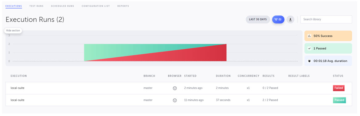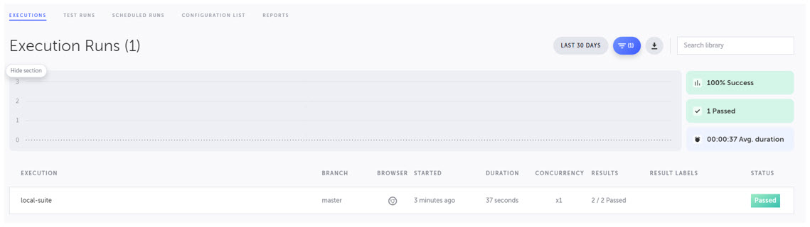 Testim will take control over your mouse and begin running the selected tests in your local browser. Once the tests have completed, you will see the Execution Runs results screen.