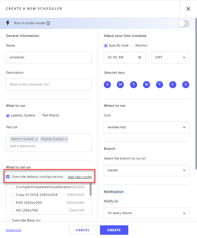 Either select which config you would like the scheduler to run, or create a new config.