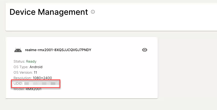--device-udid: (mandatory) enter the local device UDID. This can be a physical device that is connected to the computer or a virtual device that is provided by Xcode or Android Studio. This ID can be obtained by opening TMA > Device Management, clicking Device Management on the top menu, and copying the UDID of the device.