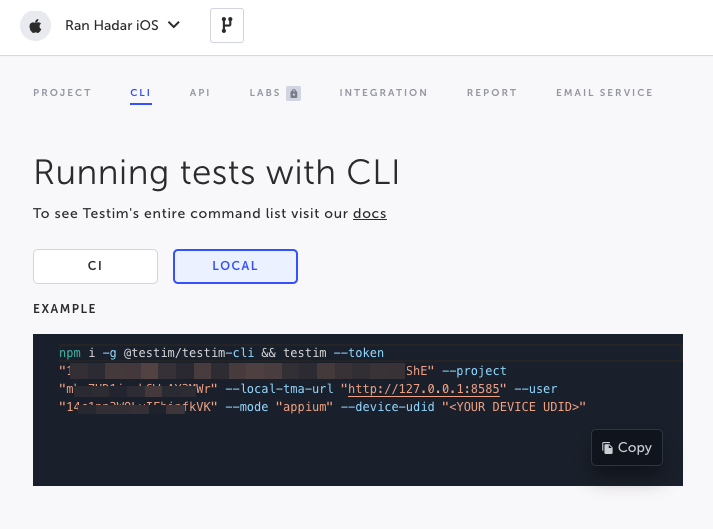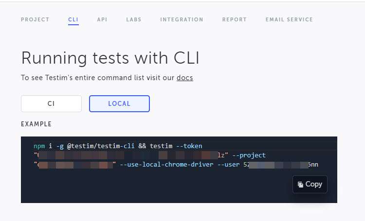 You can run your tests through the command line interface and integrate with your CI platform. Testim offers a CLI command generator that creates the basic command based on the selected configuration. The command can be then copied to the CLI and additional flags can be then added. For more information, see Command line interface (CLI).