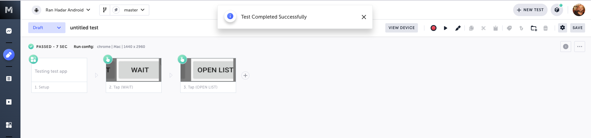 The device viewer window opens and runs the test actions. When the test is completed, a pop-up window indicates whether the test was successful.