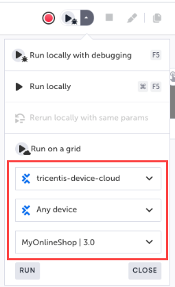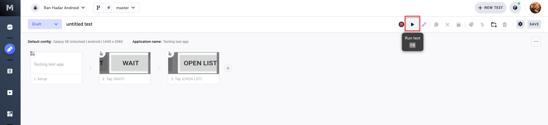 Running a mobile test remotely requires a grid connection and Mobile Configuration. The mobile configuration will determine specific mobile devices to use in the run, however if a mobile configuration is not provided, Testim will use the first available mobile device from the selected grid. You can run a single test remotely on a grid using the test editor. For more information on grid management, see Grid management. → To run a mobile test remotely: