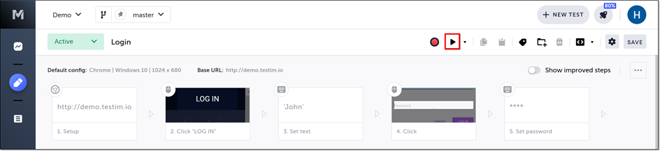 You can run one or more tests from Testim’s Test List. Tests run in this way will only run locally. → To run a test from the Test List: