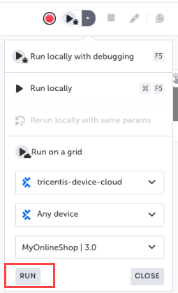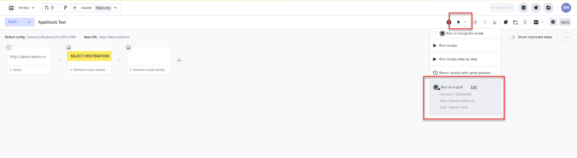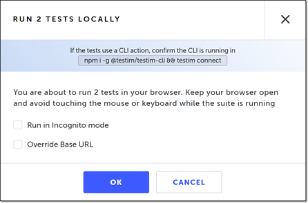 You can run a single test locally or remotely on the Grid using the Testim Automate UI. You can also run the test locally or remotely in Incognito mode.