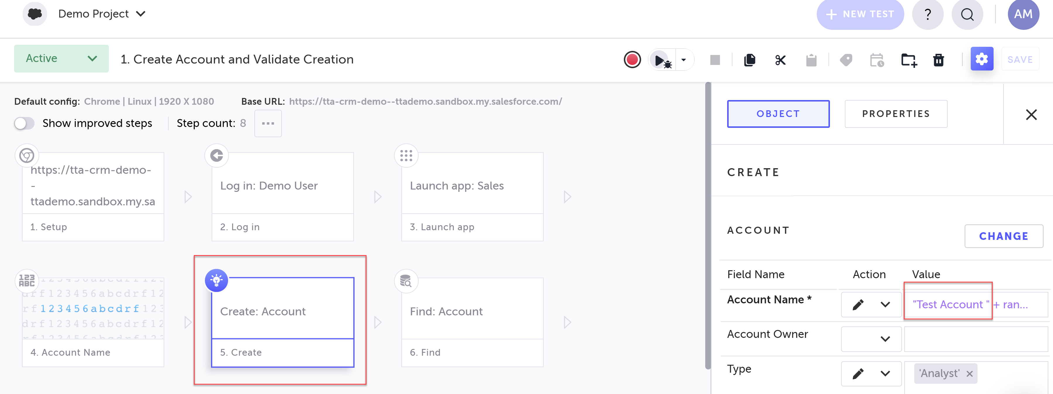 The following test includes a Create Account step and the Account Name field includes the prefix "Test Account" followed by a Random Value suffix.