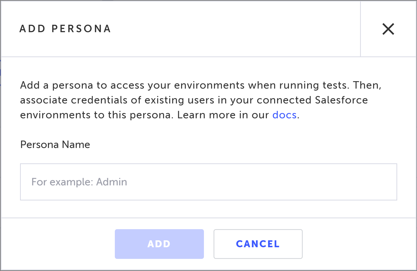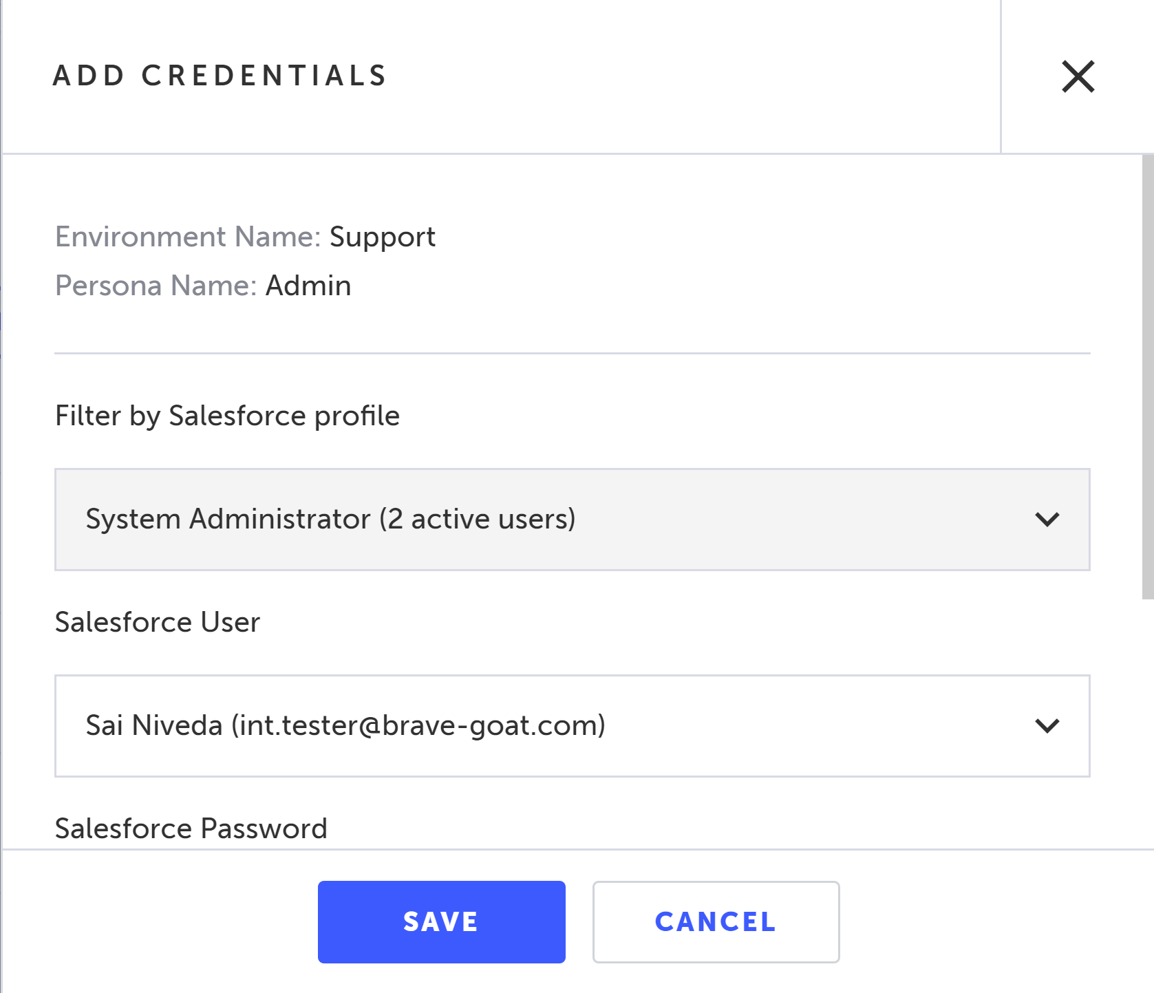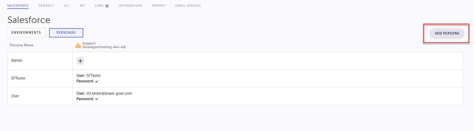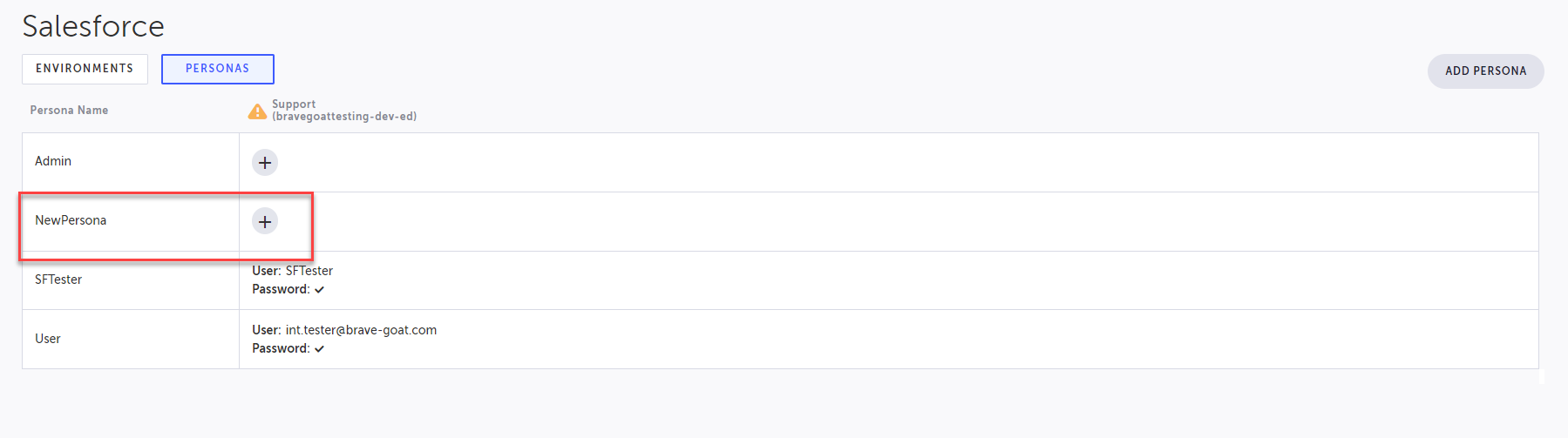 Personas in Testim for Salesforce are user types, such as admin, sales, or customer. Personas are used to access your Salesforce environment when running tests. After creating a Persona, you will associate it with the credentials of existing Salesforce users in your connected Salesforce environment. This way you can switch between various environments (e.g., Dev, QA, Production, etc.) without the need to re-write the test. This process assumes that you have connected your Salesforce environment to Testim for Salesforce. For more information see, Connecting your Salesforce environment