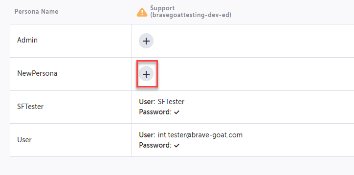 The credentials will be displayed in the table on the Persona Name row and under the relevant environment column. When running the test you will be able to select the relevant environment for the test, which includes all the personas that were configured.