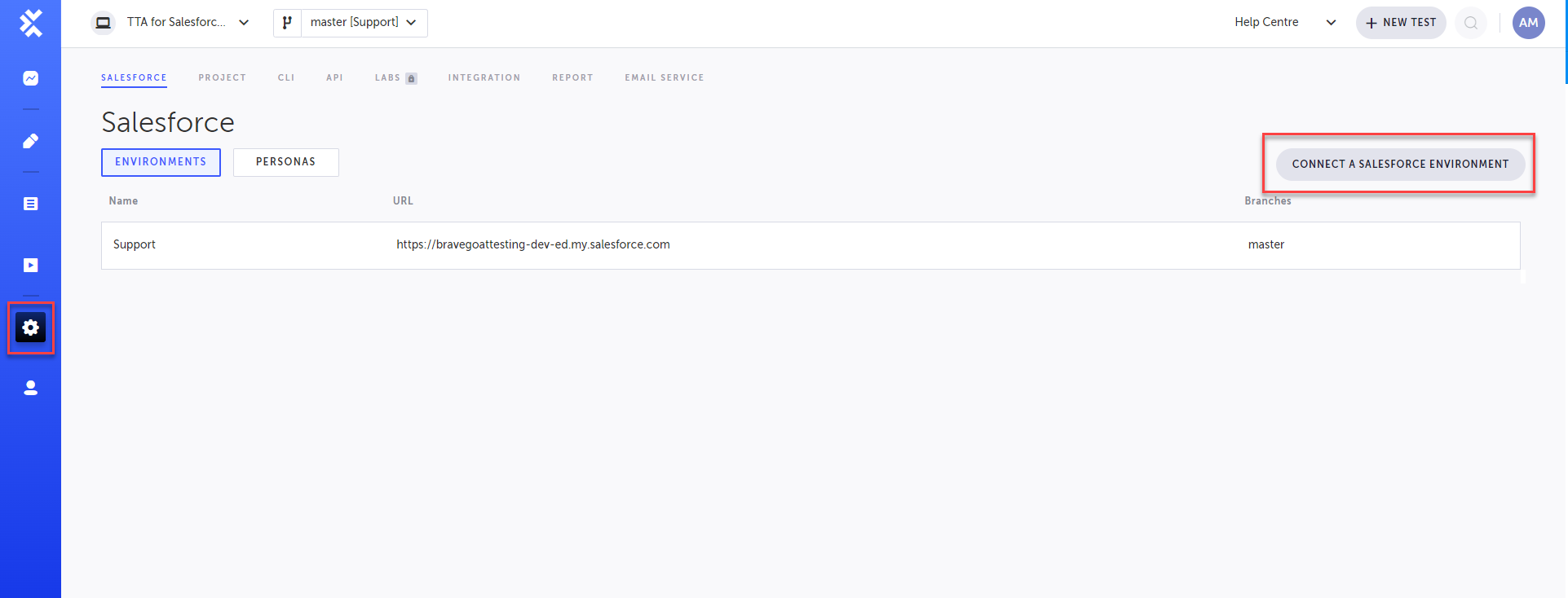 Before you create a Testim for Salesforce test, you need to connect a Salesforce environment to Testim for Salesforce. Each environment is associated with one or more branches (a branch can be associated with one environment).