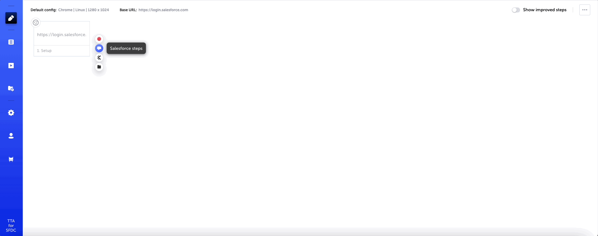 Salesforce steps can be manually added to the test. These steps cover common actions in Salesforce that are pre-populated with the records and fields from your connected Salesforce environments. The steps consist of common operations, record operations, and API operations.