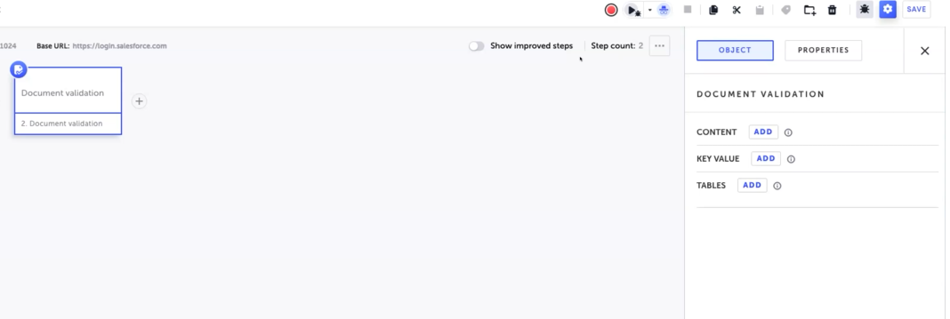 Under the Salesforce steps tab, click Common operations and select Document validation step.