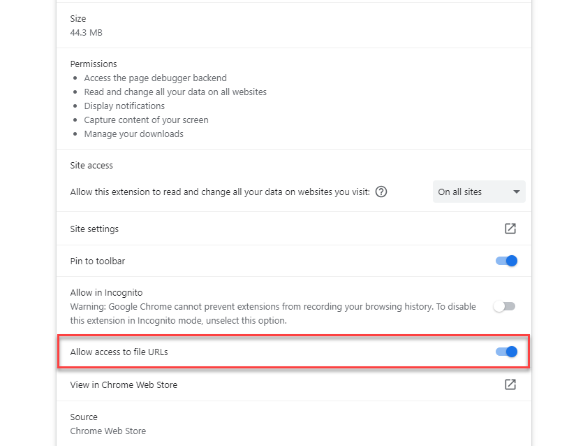 Enable the Allow access to file URLs setting.