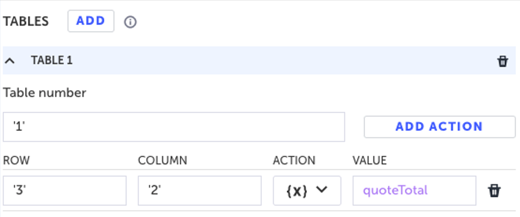 The following example will extract the value in the PDF that is located in the third row, second column of the first table and store it in a variable called quoteTotal.