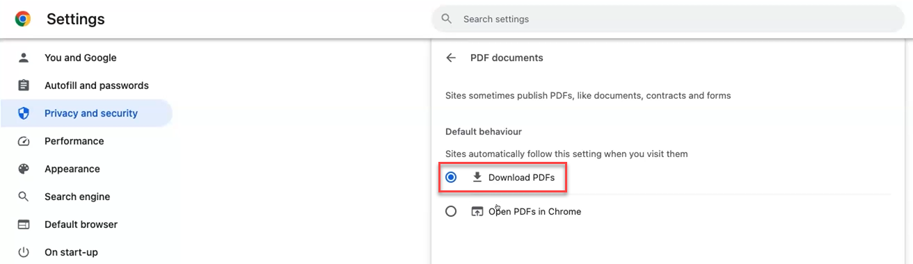 Enable the Download PDFs setting on your Chrome Browser: The setting is located at - Settings > Privacy and security > Site settings > Additional content settings > PDF documents. Under Default behavior make sure the Download PDFs option is selected.