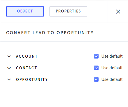 The Convert lead to opportunity step is added and the following Object properties is displayed.