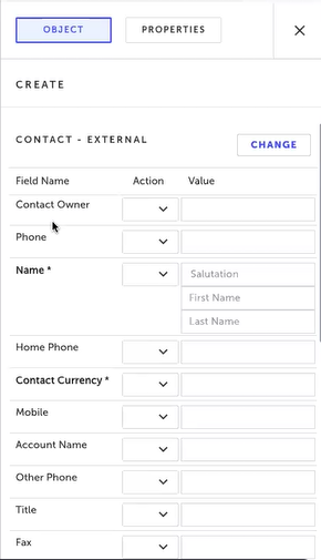> > > If at this point you want to select a different Object and Record Type, click Change and select it again. The list of fields for the record from the connected Salesforce environment is displayed. Fields that are indicated with (*) are mandatory. Hovering you mouse over the field name displays the data type and API name of the field in Salesforce.
