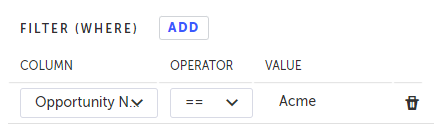 Under the Filter (Where) section, click Add to add a filter. The filter selects the rows in the related items list by matching the filter criteria. Specify the following: