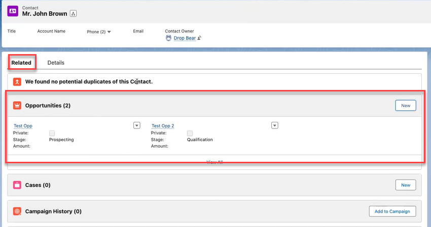 The related list item is the Opportunity (Test Opp and Test Opp 2)