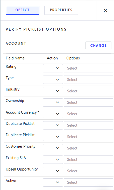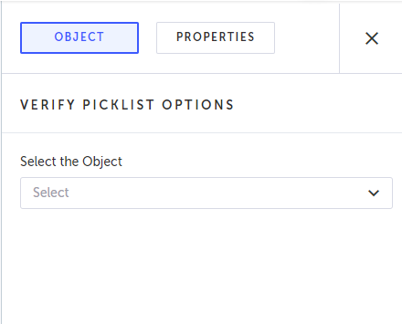 Click the Select the Object drop-down menu and select the desired object type. The object type determines the type of object of the record for which you want to verify the picklist options.