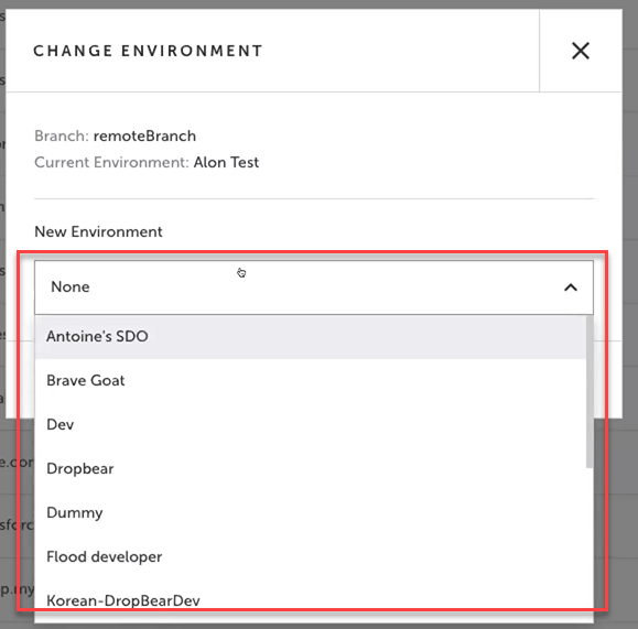 In the Change Environment dialog, under New Environment, select the desired environment from the drop down menu.