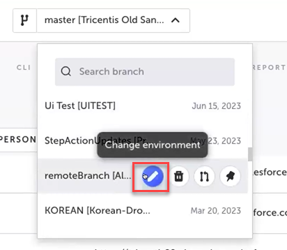 Click the Change environment button on the desired branch.