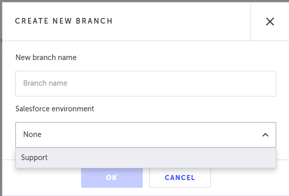 Each Salesforce environment is associated with one or more branches. The association is done through the configuration of the branch itself. To create a Salesforce environment, see Connecting a Salesforce environment.
