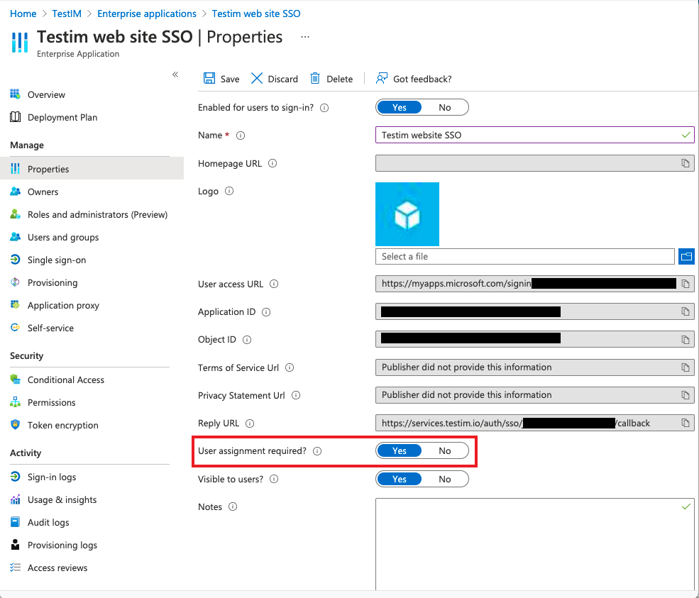 Still in Azure, go to the Properties screen in the User assignment required option turn it ON or OFF as required.
