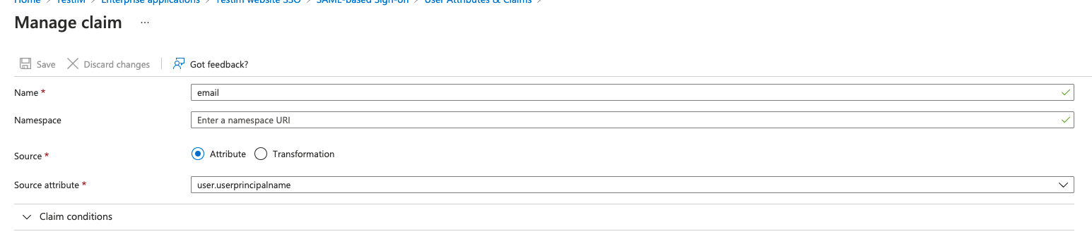 Source attribute: user.mail or user.userprincipaname. You can check which one by entering one of your organization’s users in Azure AD and then check which field you can see the email address.