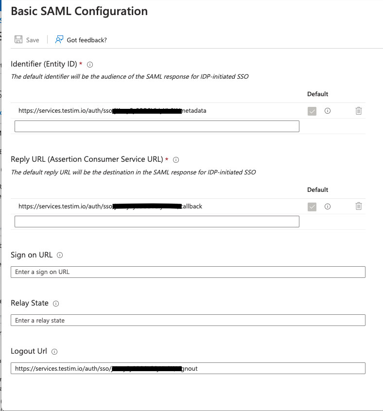 Go back to the Azure tab and paste the copied Assertion Consumer Service URL into the Reply URL* field and save.