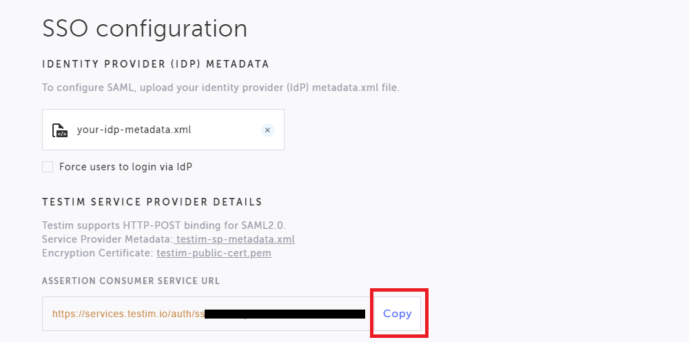 Go back to the Testim tab, and under Testim Service Provider Details, under Assertion Consumer Service URL, click the Copy button.
