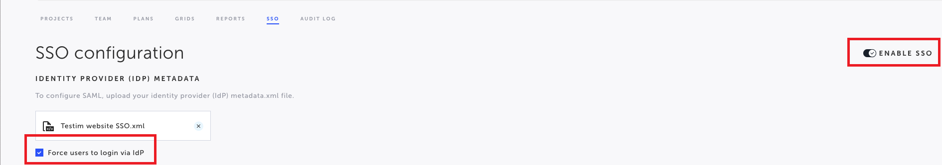 To ensure all users are only able to login through Azure, and not through the regular Testim login page, toggle the Enable SSO on and select the Force users to login via idP checkbox.