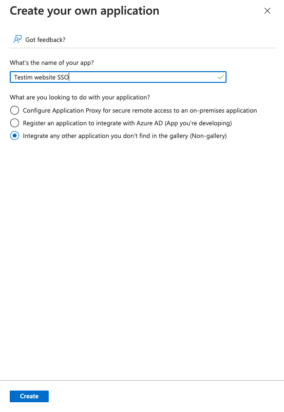 Under What's the name of your app?, enter a name for the application (e.g., Testim Website SSO).