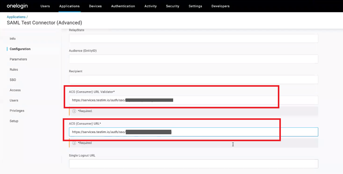 Paste the copied Assertion Consumer Service URL into the ACS (Consumer) URL Validator field and into the ACS Consumer URL field.