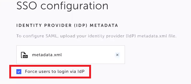 To ensure all users are only able to login through OneLogin, and not through the regular Testim login page, select the Force users to login via idP checkbox.
