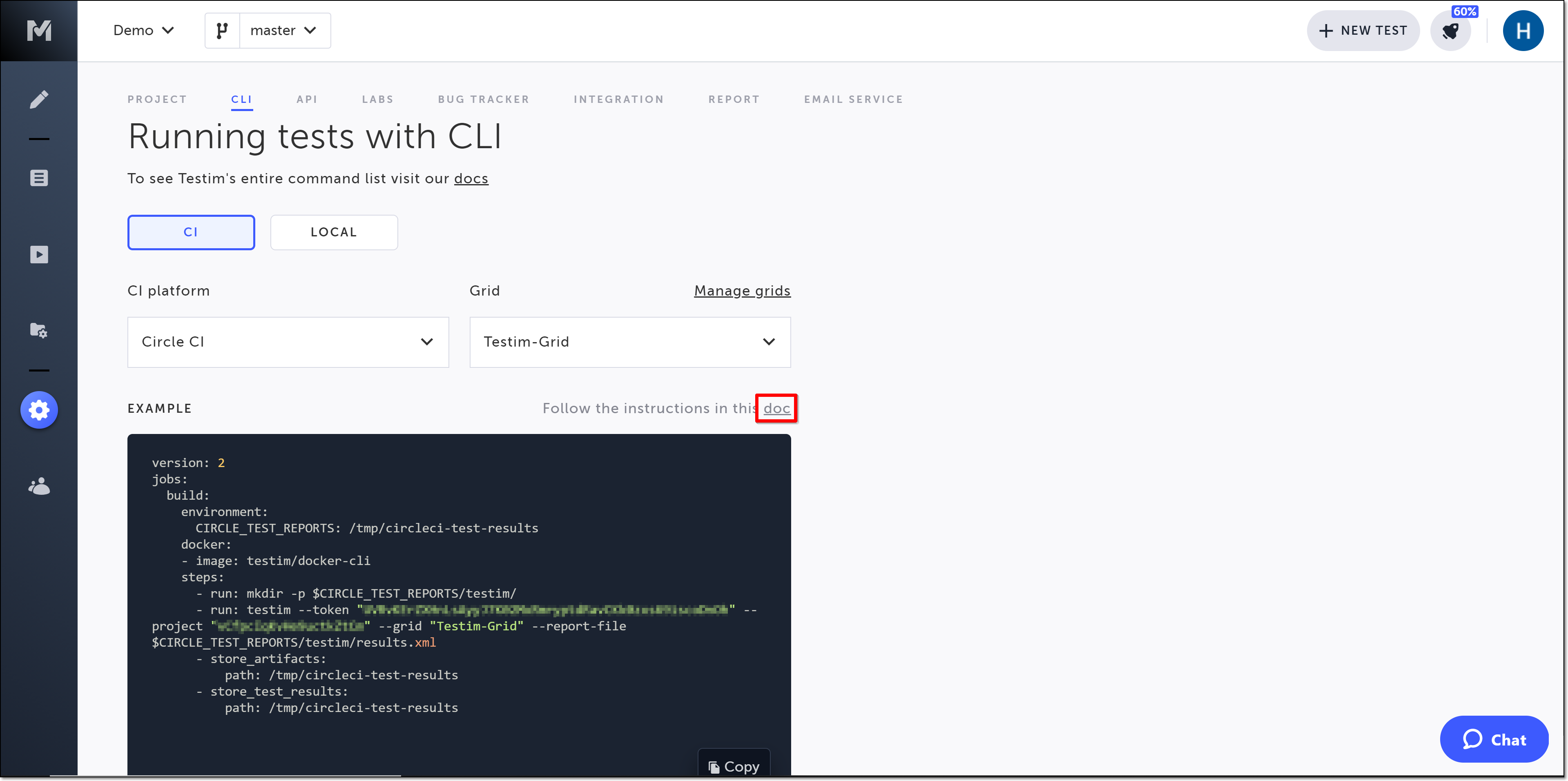 Click the doc link to open a new tab with integration instructions for your chosen CI.