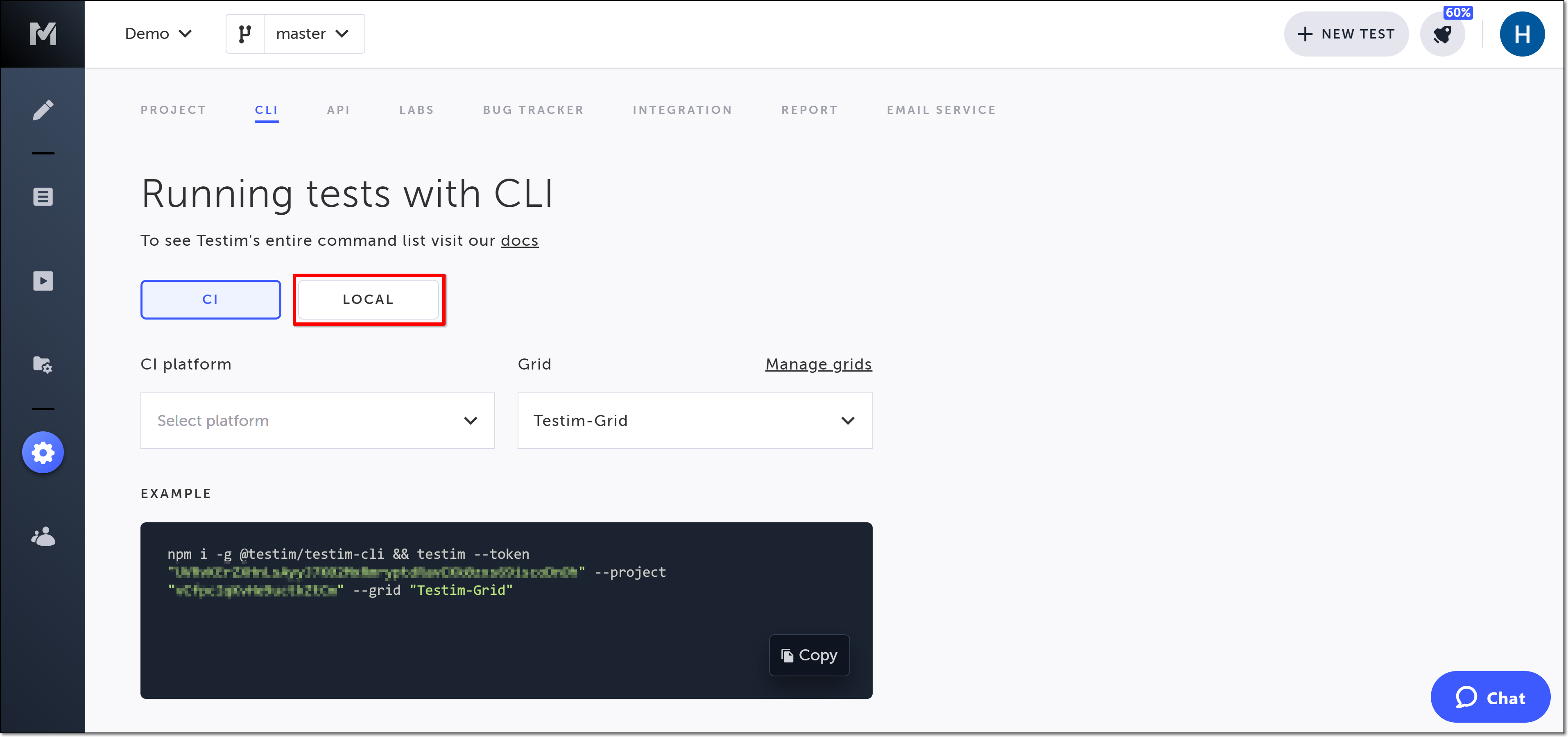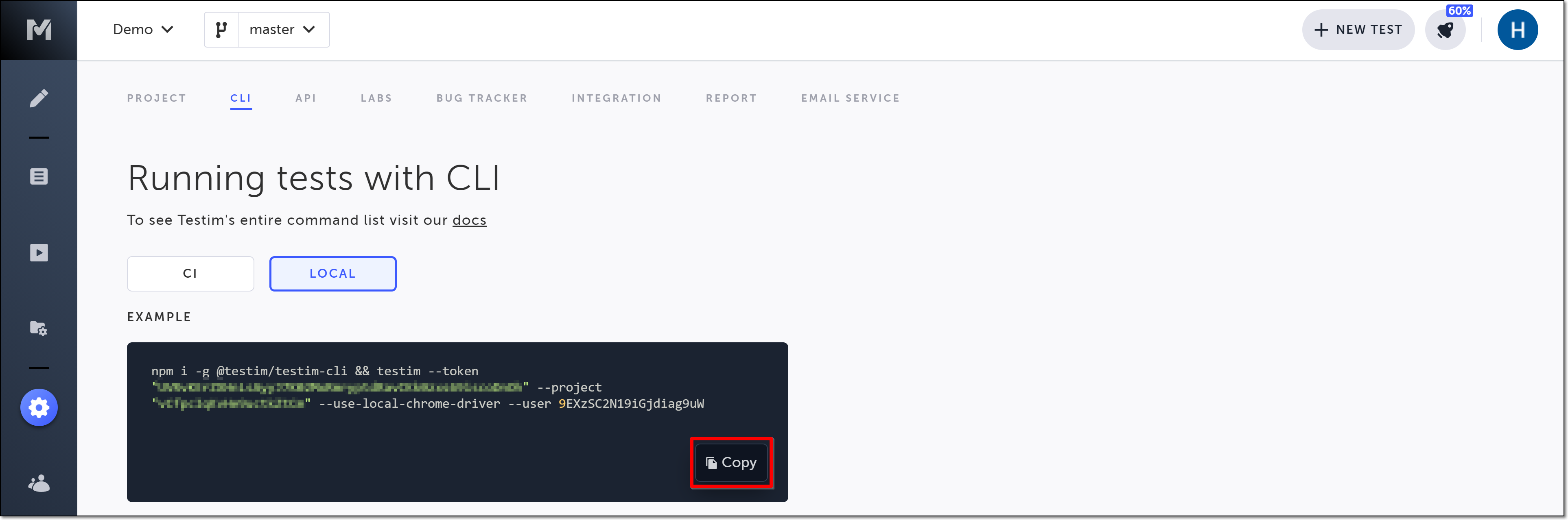 On the Settings > CLI tab you can generate the base code you will need to run your tests using the command line interface (CLI). You can run your tests using the CLI in two ways: