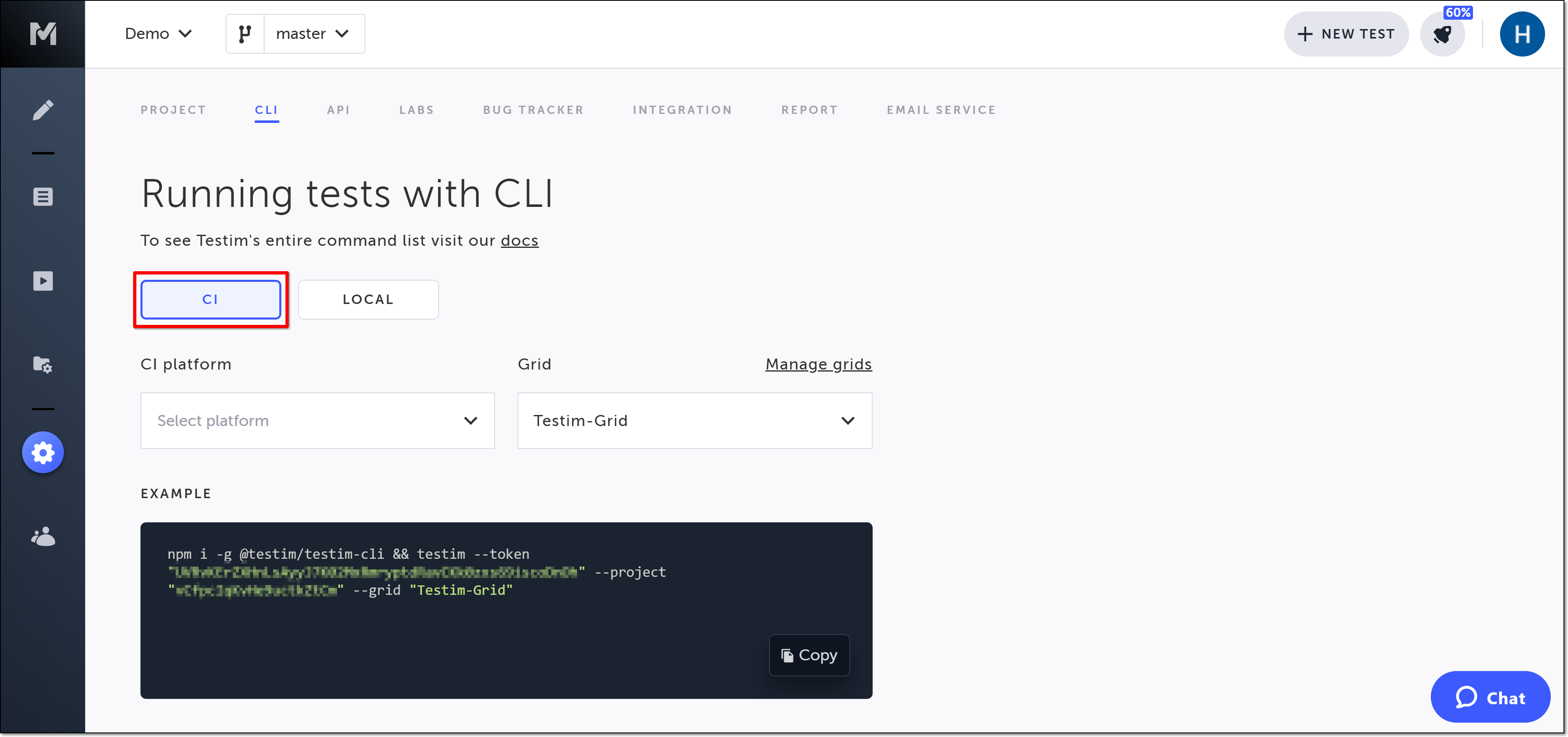 You can integrate your tests with your CI using Testim’s CLI. Testim supports all the major CIs that can run a simple shell command. → To generate the code for your CI: