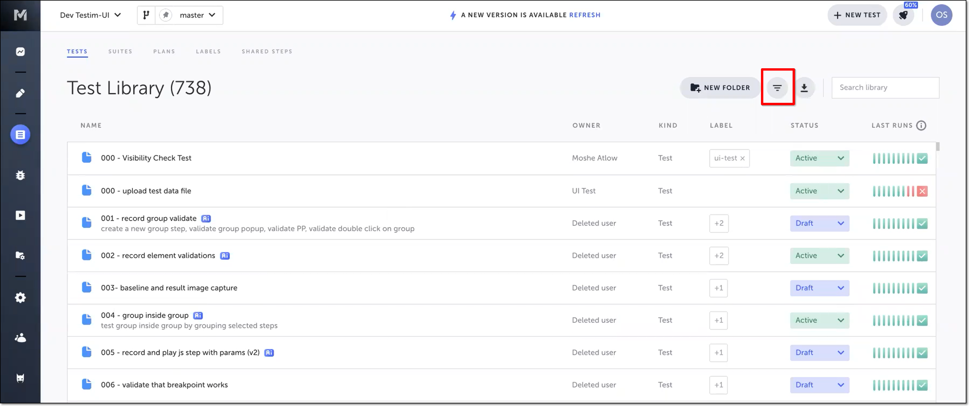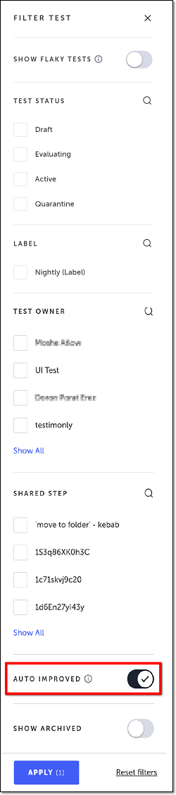 You can filter the test list in your Test Library by tests that have been auto-improved. For more information on filtering the Test Library, see Filtering the Test Library. → To filter the Test Library by auto-improved tests: