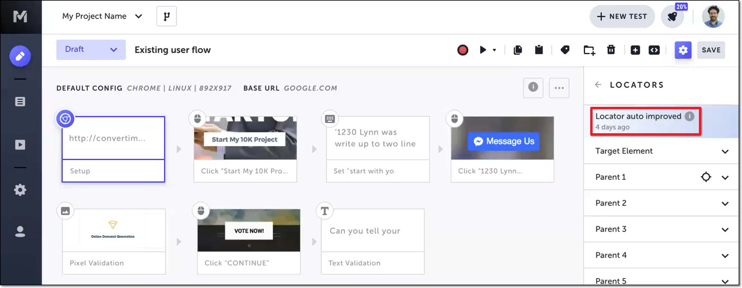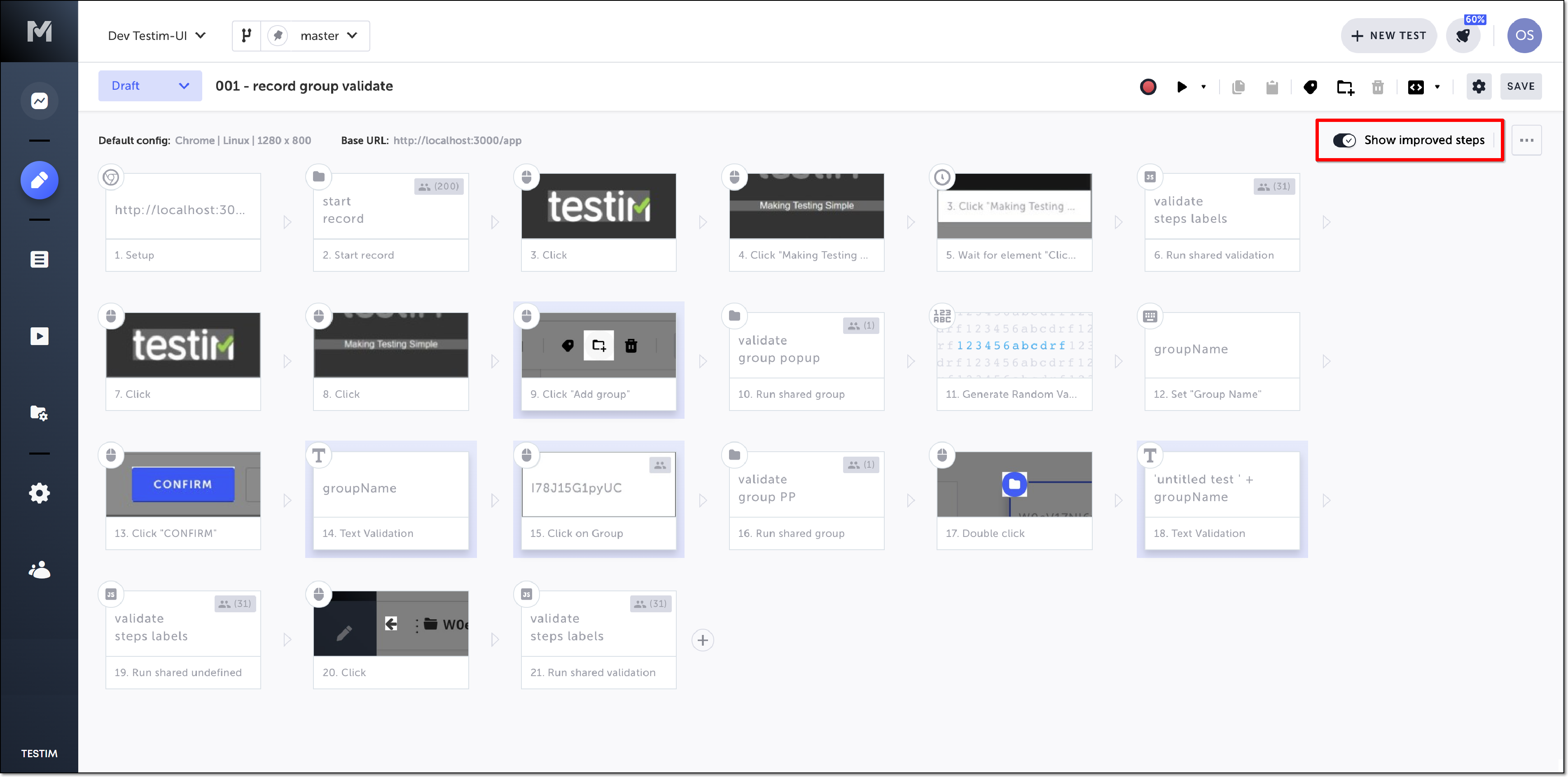 Testim creates a test revision and labels it “Testim auto improve”. You can also view which steps in a test have been auto-improved.