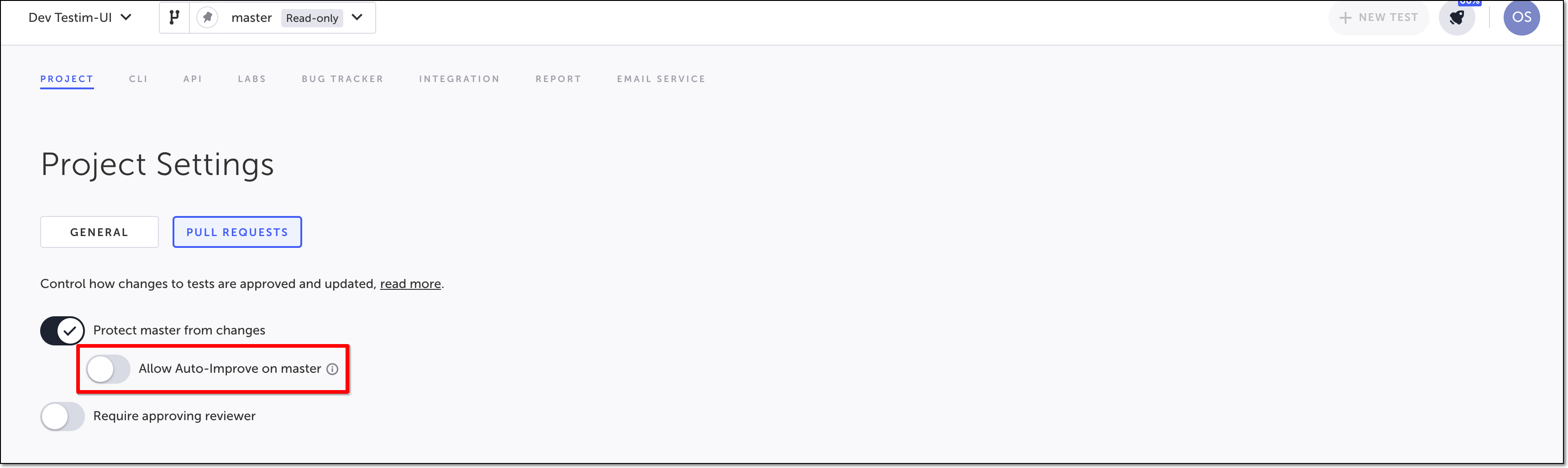 By default, the auto-improve feature only runs on master branches that are not set as read-only. You can modify the settings to allow the auto-improve feature to run on master read-only branches. → To configure the auto-improve feature to run on master read-only branches: