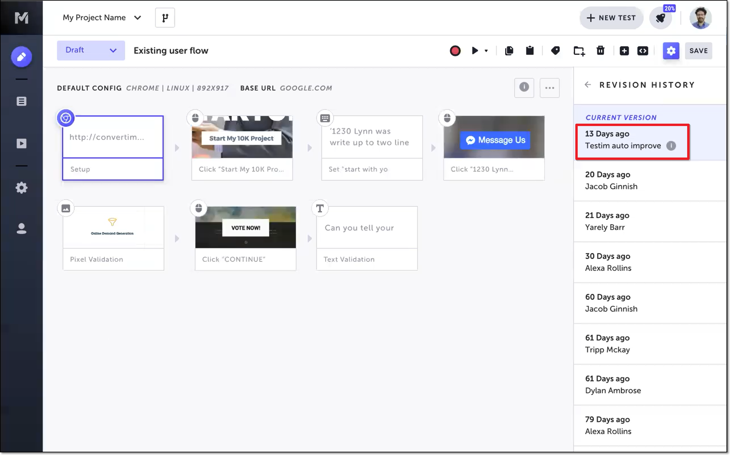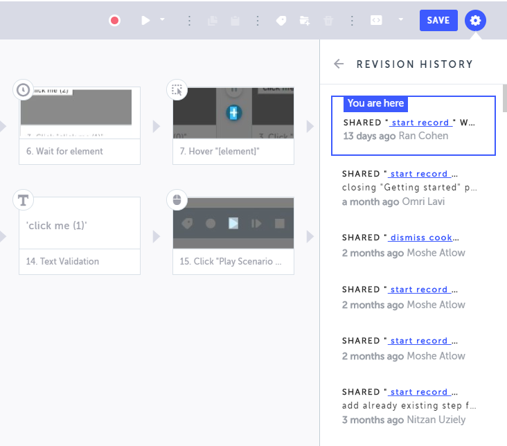 Testim automatically creates a new revision after it replaces a degraded locator with an auto-improved locator. The new revision is labeled in the Revision History panel as “Testim auto improve”. For more information, see Locators: Auto Improve. You can also view which steps in a test have been auto-improved.