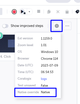 After running a test with the native override, you will see an indication in the test running summary, stating whether the native or non-native override was applied, as shown in the example below in which the Native click event option was selected.