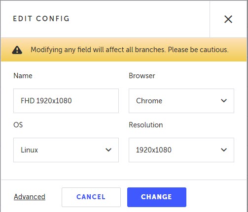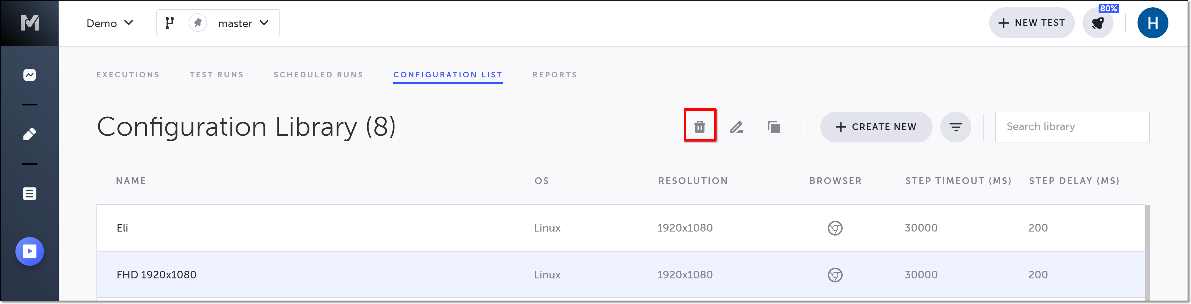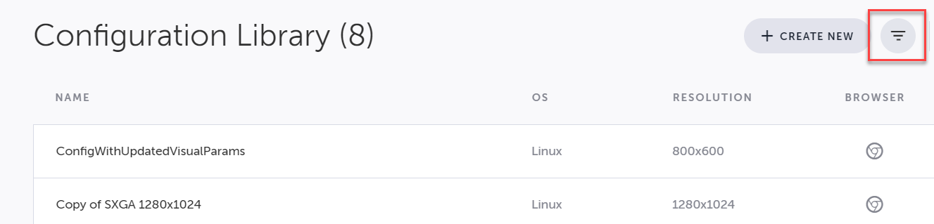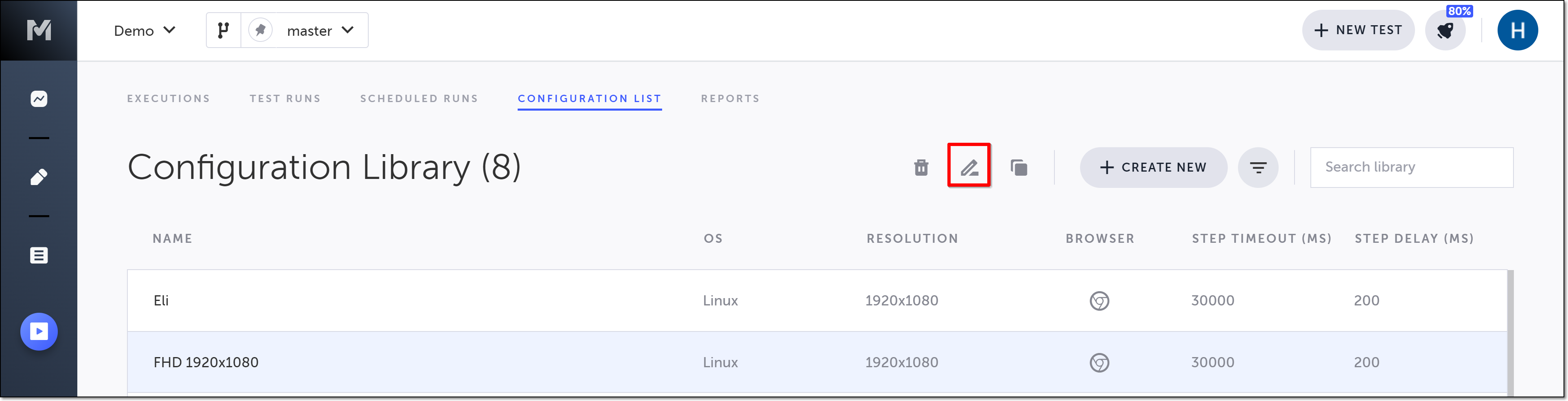 The Configuration List page shows all of the test configurations that were created and available to use for your tests, whether you run them locally or with your CLI. A test’s configuration determines the system specifications used to run the test. If you intend to run a test locally then the configuration should match your local environment. If you intend to run a test on the Testim Grid, then Testim simulates the environment that you specified. You can include a test configuration when running tests with your CLI by using the --test-config flag. For more information, see Test Config. The test configurations in this list can be created and modified in the Configuration Library or in the Setup step in the Test Editor.