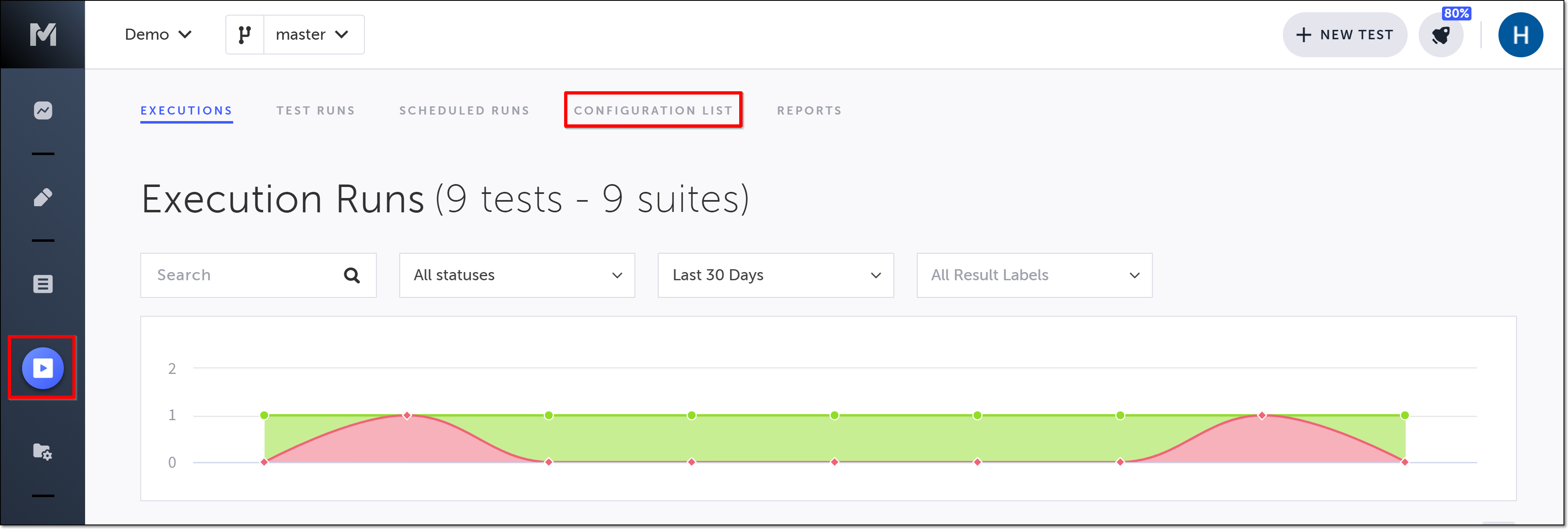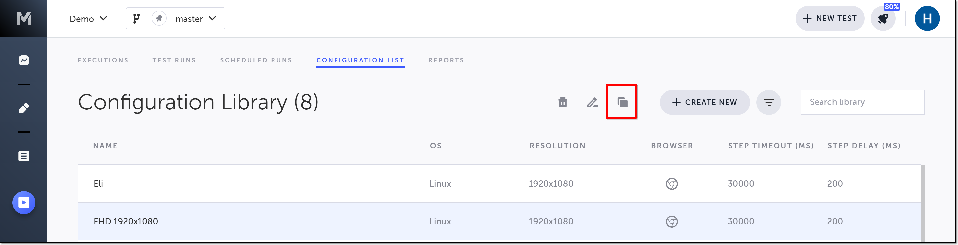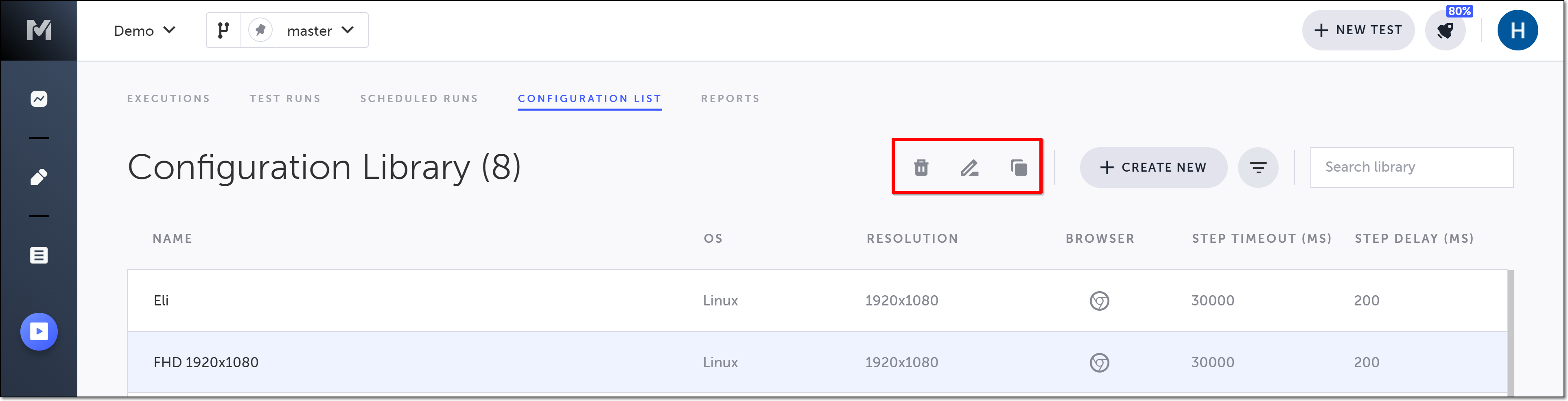 Configuration Library – You can create a new configuration in your configuration library. This configuration will apply to all steps run in a test that is set with that configuration (including tests run via CLI or Scheduler). For more information on test configuration, see Setting the Test Configuration. For more information about the CLI, see Command line interface: Test Config. For more information about the Scheduler, see Scheduler.