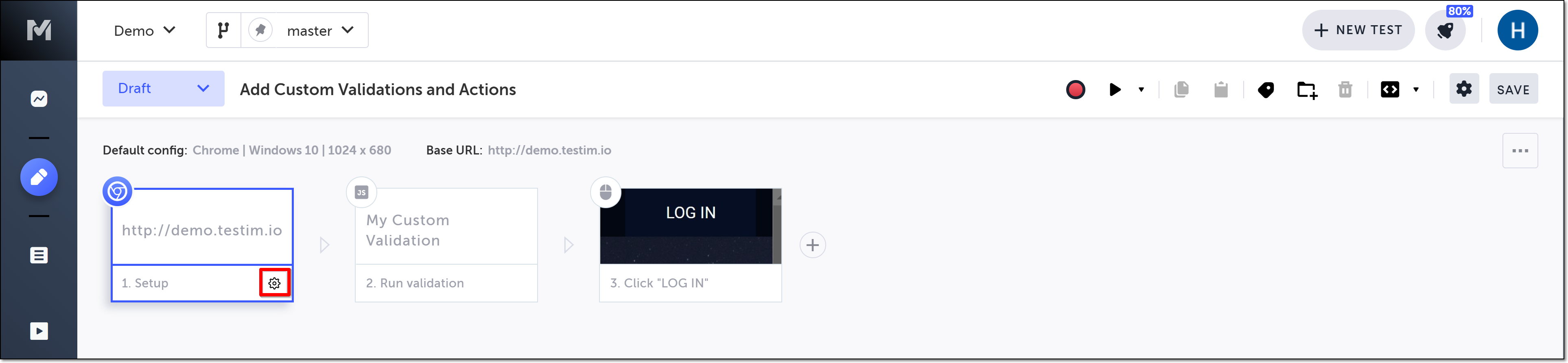 Setup Step in the Test Editor – Every test has its own default configuration accessible from the property panel of the test’s Setup step. The configuration parameters that are set in the test’s default configuration will apply unless the test is run from the CLI or a scheduler with a different configuration.